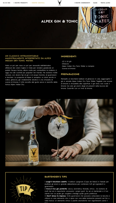 Immagini e video raccontano la storia della nascita di Alpex, inconfondibile con il suo originale logo a forma di testa di stambecco, le caratteristiche di ciascun prodotto e le modalità di utilizzo. Per gli utenti più “tecnici” e i professionisti del settore, sono ovviamente specificate le ricette di ogni bevanda, gli ingredienti, le informazioni nutrizionali e un’indicazione di alcuni punti di forza individuati dal team R&S. Per ogni Alpex vi sono inoltre alcuni suggerimenti di cocktail, i classici intramontabili e altre interpretazioni ideate per valorizzarne ulteriormente le peculiarità. La sezione “Cocktails”, infatti, non si rivolge solo ai barman più estrosi ma anche a chi vuole offrire un aperitivo o un after dinner semplice ma di sicuro effetto, utilizzando un prodotto esclusivo e ricercato. I suggerimenti di ricette e i “Bartender’s Tips” sono validi consigli pensati anche per i consumatori, sempre più frequenti, che vogliono gustare Alpex a casa e preparare un cocktail come al bar. Dalla scelta del bicchiere alla guarnizione, dalla tecnica di preparazione agli spirit più idonei da affiancare: ogni particolare è fondamentale per la realizzazione di un cocktail a regola d’arte e all’insegna della qualità Alpex.