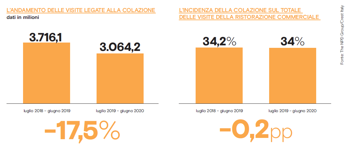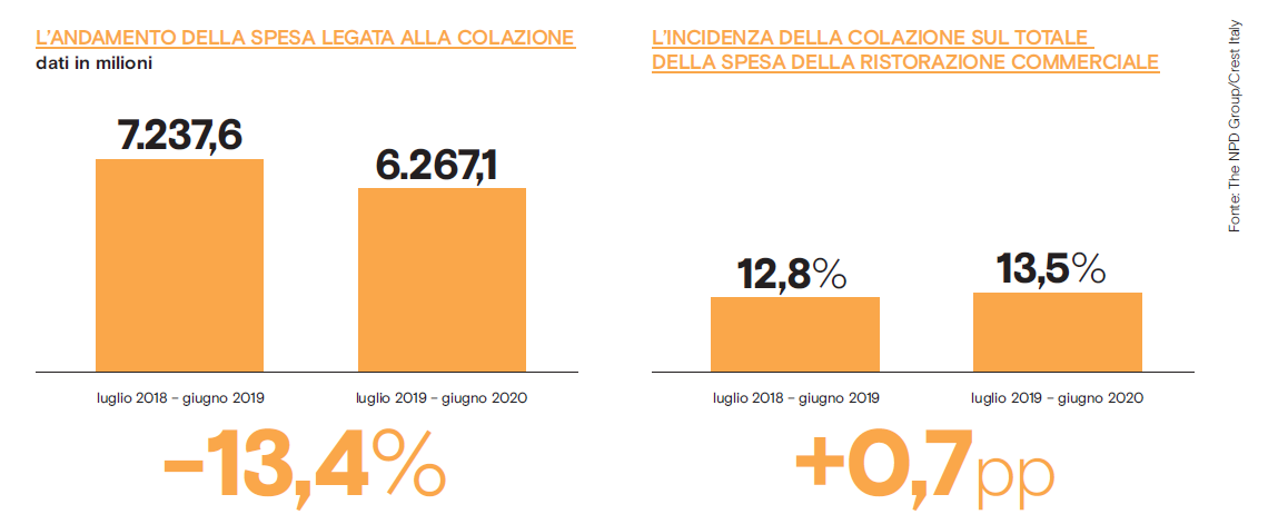 Il risultato dello scenario appena descritto si riflette nei numeri, che nell’anno mobile compreso tra luglio 2019 e giugno 2020 si muovono quasi interamente in territorio negativo. «Le visite – osserva Figura – sono calate rispetto all’omologo periodo precedente del 17,5%. Una performance costata un arretramento di 0,2 punti percentuali all’incidenza della colazione sul totale della ristorazione commerciale. E non va molto meglio neppure sul fronte degli scontrini: la spesa si è infatti contratta del 13,4%, passando dagli oltre 7,2 miliardi di euro agli attuali 6,2 miliardi. Una flessione decisa, anche se mitigata dal fatto che il peso del fatturato della colazione rispetto al mercato complessivo segna un seppur modesto incremento, accelerando dal 12,8% al 13,5%».