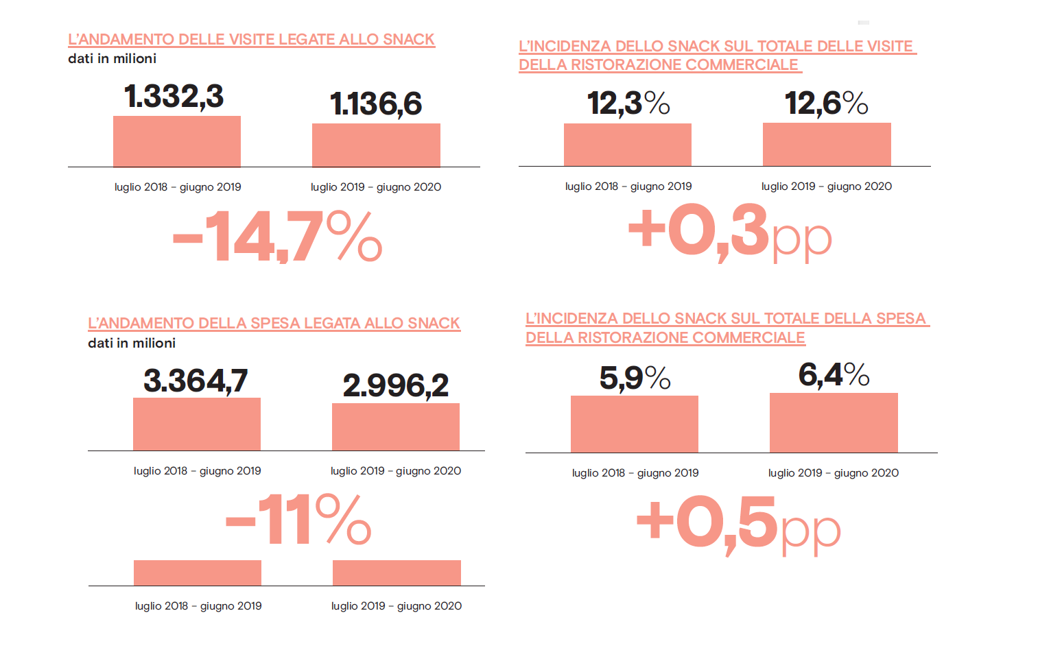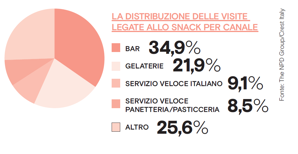 Non è stato risparmiato dalla serrata dell’horeca imposta dalla pandemia, ma rispetto ad altre occasioni di consumo, lo snacking è riuscito a limitare le perdite. Lo dicono con chiarezza i dati. «Tra luglio 2019 e giugno 2020 – osserva Matteo Figura, responsabile Foodservice NPD in Italia – la categoria ha perso sì il 14,7% delle visite, ma ha conquistato lo 0,3% di quota di mercato passando dal 12,3% al 12,6%. Un segno più che vale molto, perché rappresenta la cartina al tornasole della maggiore capacità di tenuta di questa voce rispetto ad altre, penalizzate da cali più importanti». Ma non solo. I numeri rivelano infatti che la spesa per lo spuntino si è ridotta a ritmi più moderati rispetto all’andamento delle visite, facendo segnare una flessione contenuta all’11%. «Un trend – spiega Figura – che da un lato certifica l’aumento dello scontrino medio per singola visita e dall’altro permette allo snacking di ampliare la propria market share in termini di valore: la categoria ha infatti guadagnato mezzo punto percentuale, arrivando così a pesare per il 6,4% sul totale complessivo della ristorazione commerciale»