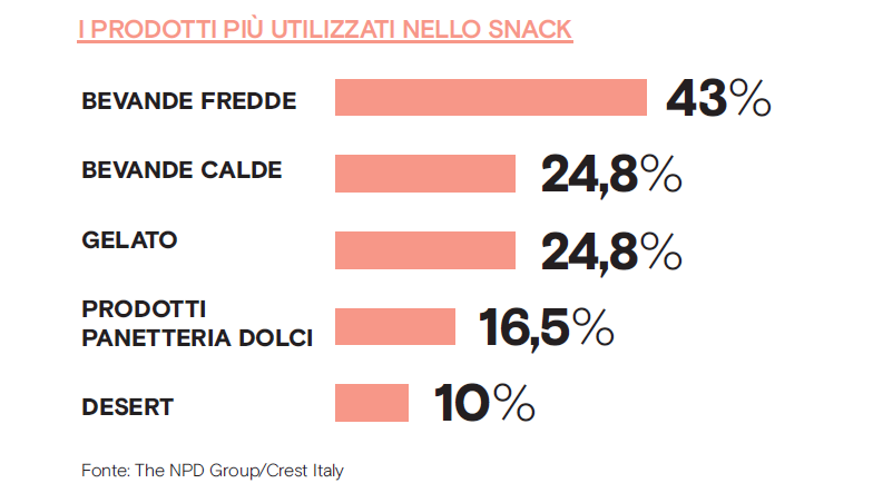 Il risultato è di quelli netti, che non lasciano spazio a interpretazioni: la partita è vinta da gelati, prodotti dolci da forno e dessert. Se si analizza la parte food della classifica delle referenze più utilizzate per lo snack, emerge infatti una chiara sconfitta del salato, grande assente tra i top 5.
