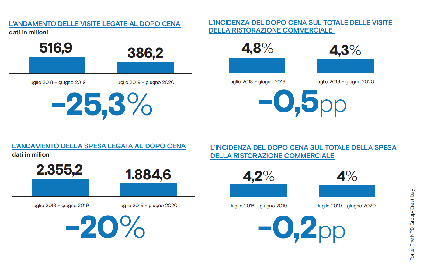 Inutile nasconderlo: il mondo che ruota intorno al leisure e all’intrattenimento è tra i più penalizzati dalle misure imposte dall’emergenza sanitaria. Chiusure e restrizioni hanno inciso qui più che altrove. Non stupisce quindi che i dati inanellino una lunga e poco confortante serie di segni meno: secondo NPD Group, tra luglio 2019 e giugno 2020 è andato perso ben un quarto delle visite e un quinto della spesa rispetto all’omologo periodo precedente. E così la categoria arretra anche in relazione all’incidenza sul totale mercato della ristorazione, passando dal 4,8% al 4,3% alla voce visite, e dal 4,2% al 4,0 sul fronte del giro d’affari.