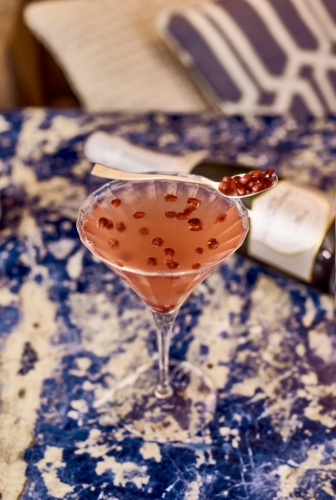 Gli ingredienti “segreti”: Champagne Comte de Montaigne Brut Grande Réserve; Vodka; succo di Cranberry echicchi di melograno per dare personalità alla decorazione.