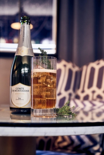 il Brut Grand Réserve, espressione della freschezza di Comte de Montaigne, è il protagonista assoluto di questo drink. Dal perlage vivace, ricco di bolle fini e persistenti, regala aromi di grande intensità, ricchi e fruttati. In bocca è fresco, non dolce, e unisce armonia, rotondità e lunghezza persistente.
