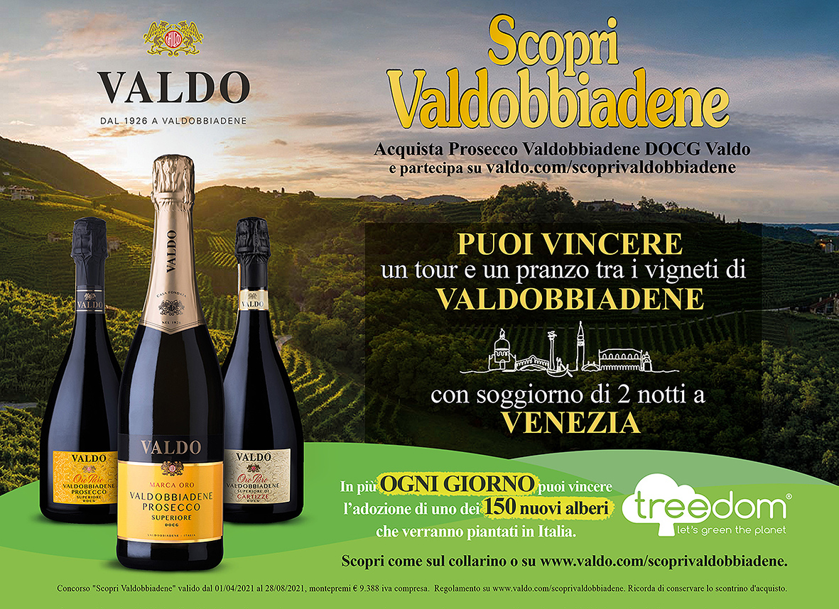 Dal 1° aprile al 28 agosto, acquistando un Prosecco Valdobbiadene DOCG Valdo, Marca Oro o Oro Puro, e registrandosi sul sito valdo.com/scoprivaldobbiadene, si parteciperà all’estrazione finale per vincere un soggiorno a Venezia, di 3 giorni e 2 notti, in hotel 4 stelle, affacciato sul Canal Grande, e un’escursione di una giornata a Valdobbiadene con un pranzo tra i vigneti. Un sogno da vivere intensamente, un’esperienza unica nel suo genere, come uniche sono le colline di Valdobbiadene, il Prosecco e Venezia. Due luoghi incomparabili per le caratteristiche naturali e artistico/culturali, che vantano il prestigioso riconoscimento di sito Unesco Patrimonio dell’Umanità.