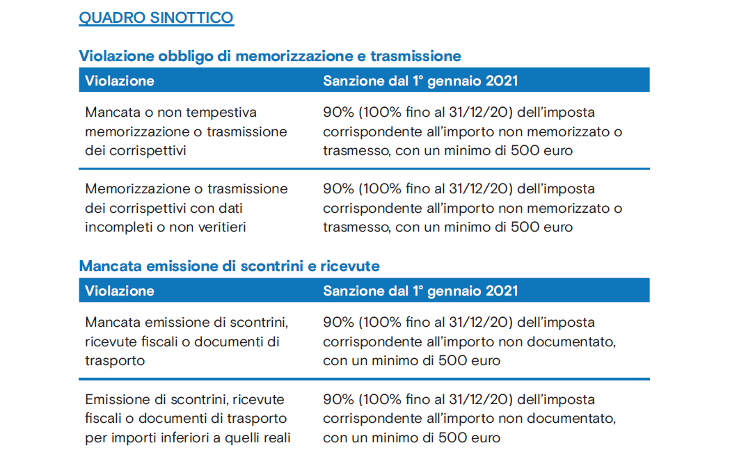 L’art. 1, commi da 1109 a 1115 della Legge di Bilancio per il 2021 trattando delle modifiche alla memorizzazione e trasmissione dei corrispettivi ha anche aggiornato il quadro sanzionatorio così sintetizzato: