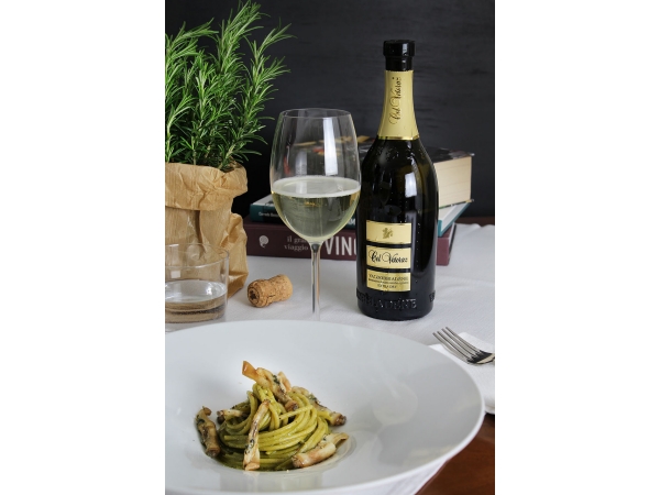 La prima proposta è un delicato Spaghettone alla crema di erbette e i cannolicchi di laguna, un piatto cui si affianca il Valdobbiadene DOCG Extra Dry, scelto perché col suo leggerissimo residuo zuccherino è ideale per accompagnare la sensazione verde data dalle erbe spontanee regalando grande armonia d’insieme. Invitante e friendly, è ottenuto grazie ad un’accurata selezione delle uve di collina dell’esclusivo comprensorio di Valdobbiadene, ha un gusto equilibrato e toni eleganti.