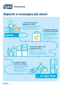 E sta lanciando una nuova pagina sul proprio sito web con preziosi suggerimenti per aiutare i ristoranti a garantire l'igiene dalla cucina alla consegna. Troverai una guida con suggerimenti più dettagliati per garantire cibo e consegne sicure, un pratico poster sull'igiene delle mani, una guida per utilizzare i codici QR e altro materiale utile per il personale del ristorante. Per ulteriori informazioni, visitare https://www.tork.it/la-tua-attivita/soluzioni/panoramica/ristorazione/asporto-e-consegna/