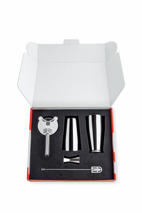 Alessi propone cinque diversi mixing kit: North Tide, Our Roots, The Player, Solar Eclipse e Lunar Eclipse, ciascuno dedicato a un cocktail creato con la consulenza del mixologist di fama internazionale Oscar Quagliarini. Una collezione completamente realizzata in acciaio inossidabile, nella quale scegliere tra versioni lucide e con rivestimento in PVD color rame. Alessi mixology è completata da un’inedita versione del famoso Agitatore americano o “Boston”, disegnato da Ettore Sottsass nel 1979.