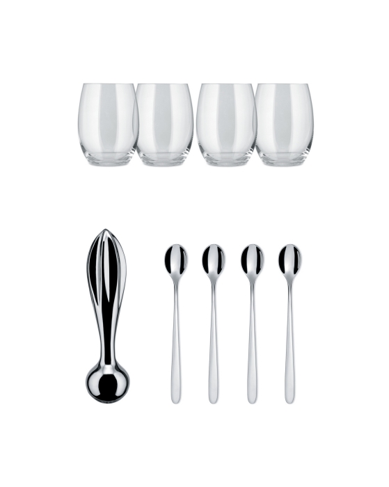 The Player è un mixing kit dalle geometrie eleganti, ideale per la preparazione di long drink. La raffinata manualità del pestello/spremiagrumi “Valerio”, disegnato da Guido Venturini, incontra il disegno classico e lievemente bombato dei bicchieri in vetro cristallino creati da Stefano Giovannoni. Il set “The Player” è completato da quattro eleganti cucchiai da long drink disegnati da Ettore Sottsass: perfetto per godere in qualunque momento del piacere dei migliori mix.