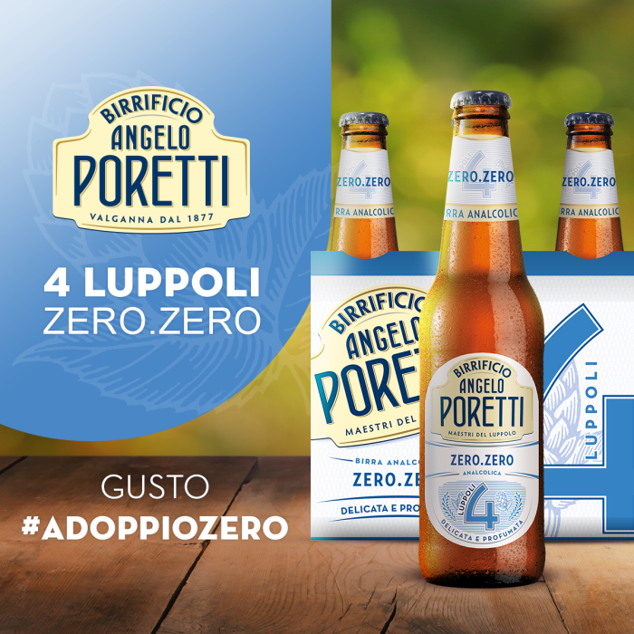 Sempre attento alle nuove tendenze del mercato, il Birrificio Angelo Poretti presenta la sua prima birra analcolica, la 4 Luppoli Zero.Zero. Questa bevanda completamente priva di alcol (0.0% di alcol) è stata ideata dai Mastri Birrai ed è caratterizzata da una spiccata armonia fra la fragranza del malto e i profumi agrumati e speziati delle 4 diverse varietà di luppolo. Grazie all’assenza di alcol la 4 Luppoli Zero.Zero è ideale per i momenti in compagnia in totale leggerezza. Un gusto sorprendente e un corpo delicato e vellutato la rendono perfetta per chi desidera una bevanda per la pausa pranzo o per un aperitivo leggero,che si abbini ai piatti semplici della cucina italiana, esaltandone il sapore.
