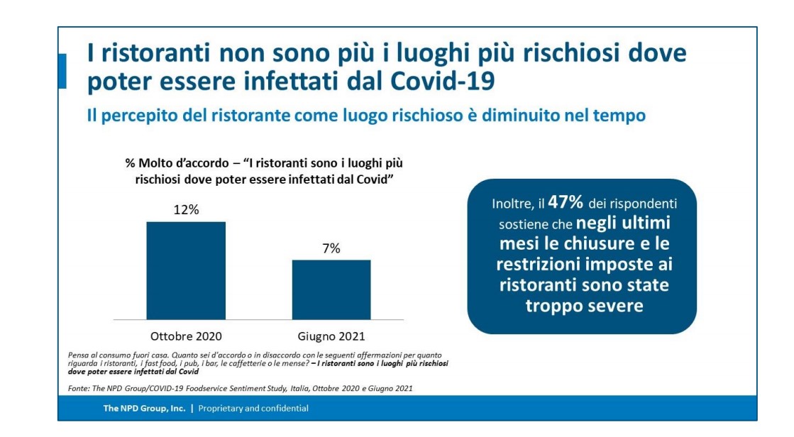 “I consumatori sono sensibili al tema della sicurezza anche se nel tempo la loro percezione è cambiata – precisa in merito Matteo Figura, Direttore della divisione Foodservice in NPD - “Le nostre rilevazioni indicano che a ottobre il 12% riteneva i ristoranti luoghi più rischiosi dove poter essere infettati dal Covid, oggi lo pensa solo il 7%”.
