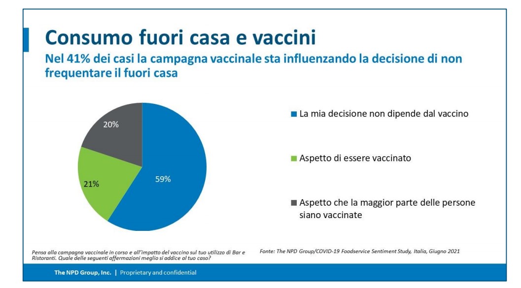 Atteggiamenti così commentati da Matteo Figura: “La percezione dell’immunità di gregge ha di certo un impatto sui consumi fuori casa. Se si vuole tornare ai livelli di mercato pre-crisi bisogna creare le condizioni affinché anche i consumatori più esigenti e selettivi possano tornare alle loro abitudini sentendosi al sicuro. Anche se un’ulteriore restrizione o regola imposta ai ristoratori complica la gestione dei punti vendita, un incentivo alla vaccinazione e l’immunità di gregge aiuterebbe, nel medio termine, ad accorciare l’ultimo miglio per tornare ai livelli di mercato pre-crisi.”