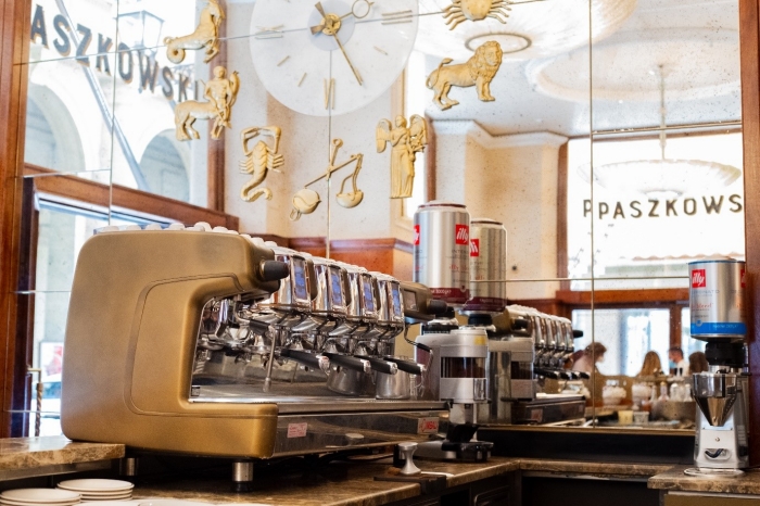 Dalla laguna veneziana, il nostro viaggio ideale continua nel centro storico fiorentino. Fondato nel 1903 come birreria dall'omonima famiglia polacca, il Paszkowski divenne ben presto un tipico “Caffè-concerto”, prerogativa che lo rese famoso in tutto il mondo e che lo distingue tutt’oggi da tutti gli altri locali del centro. Punto di incontro di intellettuali fiorentini o di passaggio a Firenze fin dalla sua fondazione (basti pensare a Giovanni Papini, Dino Campana, Gabriele D’Annunzio, Eugenio Montale e tanti altri), il locale domina oggi la meravigliosa piazza della Repubblica con serate musicali, eventi, convegni, meeting e sfilate di moda. Dichiarato Monumento Nazionale nel 1991, il Paszkowski ospita la formidabile Cimbali M100, con scocca in color oro che riprende le nuance interne del locale.