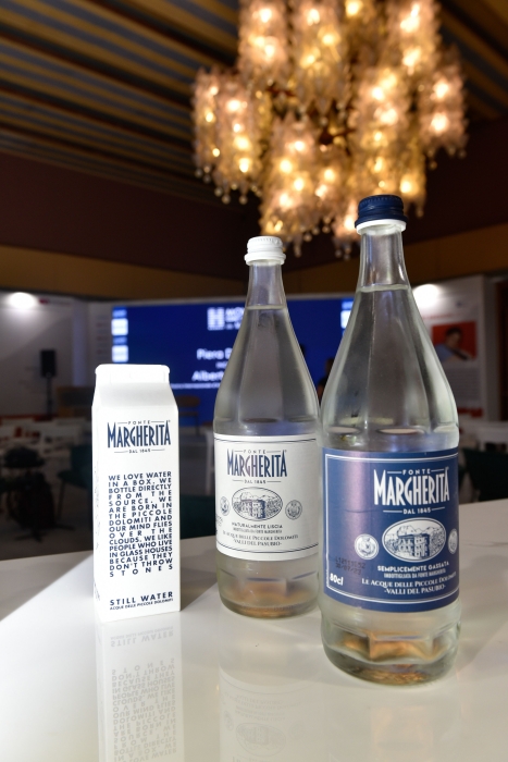 Gli ospiti dell’area lounge avranno la possibilità di gustare sia la leggerissima acqua minerale, minimamente mineralizzata, che sgorga dalle incontaminate Piccole Dolomiti sia le sette bevande analcoliche Fonte Margherita che oltre alla pura acqua minerale vedono solo l’aggiunta di selezionati aromi naturali. Il tenore estremamente basso di nitrati presenti nell’acqua minerale Fonte Margherita è indicativo della straordinaria purezza della fonte. Per l’aperitivo c’è il nuovo analcolico Spritz Zero, zero alcool zero solitudine, una nuova gustosa bibita per socializzare nel rispetto dei principi salutistici. Le bottiglie sono rigorosamente in vetro e vintage nella forma. Anche le etichette delle bottiglie riproducono forme e geometrie del passato reinterpretate in chiave moderna dall’esperta designer Francesca Chiani. Il nuovo pack di acqua minerale, in cartone interamente riciclabile, è ideale per ogni esigenza, comodo da trasportare anche in borsa. La grafica è a quattro mani, oltre a Chiani le illustrazioni sono del giovane disegnatore vicentino Ale Giorgini.