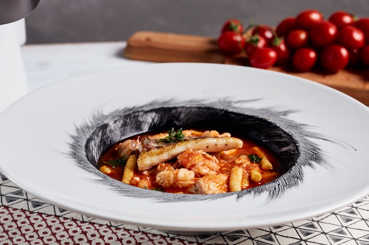 Inserire nel Companion l’accessorio per mescolare, l’olio di oliva, il mezzo spicchio di aglio, le erbe e far soffriggere a 140° per 2 minuti a velocità 1, delicatamente. Aggiungere i pesci partendo dalla coda di rospo, dopo 1 minuto lo scorfano, poi la triglia e i gamberi. Sfumare prima il vino bianco, poi con l’aceto, aspettare altri 2 minuti, sempre a 140°. Aggiungere il concentrato e il fumetto, impostarlo a 130° sempre a velocità 1 per 15 minuti. Aprire il Companion versare i passatelli, far cuocere a 140° per 3 minuti mescolando sempre delicatamente.