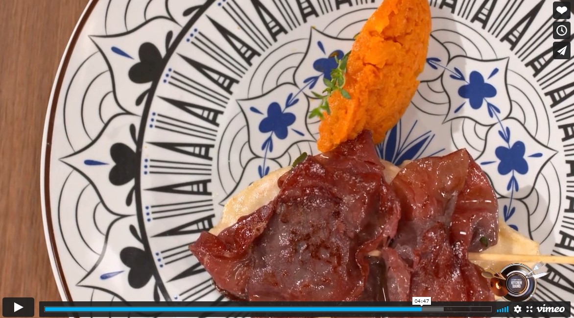 Cuocere i saltimbocca in una padella con burro e bagnare con un pò di aceto di mele e far sfumare. Impiattare i petti con il purè di carote e una fogliolina di timo.