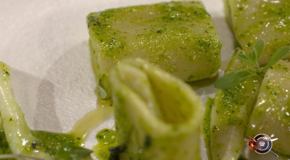 Condire i paccheri con il pesto, aggiungere in ultimo i calamari e mantecare con olio EVO