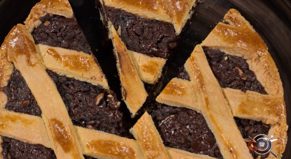 Preparare la pasta frolla: mischiare lo zucchero con il burro a temperatura ambiente sino ad amalgamarli, aggiungere l’uovo, farina e un pizzico di sale e dare all’impasto la forma di una palla. Lasciarla riposare in frigorifero per almeno un’ora avvolta da un foglio di pellicola trasparente. Preparare il ripieno: cuocere il riso in acqua bollente salata, scolare, lasciarlo raffreddare e mischialo con il cacao. Aggiungere il cioccolato a scaglie, uvetta, pinoli, zucchero, liquore e vaniglia. Sbattere 2 uova e le aggiungere al composto e amalgamo il tutto.Stendere la pasta frolla con un mattarello e metterla in uno stampo per torte. Fare in modo che i bordi siano ben alti, e dopo avere dato la giusta forma, farcire la pasta con il ripieno. Decorare la torta con delle striscioline di pasta sulla superficie e realizzare i classici bischeri sul bordo. Cuocere in forno per circa una mezz’ora alla temperatura di 180°C, e farla raffreddare prima di servirla.
