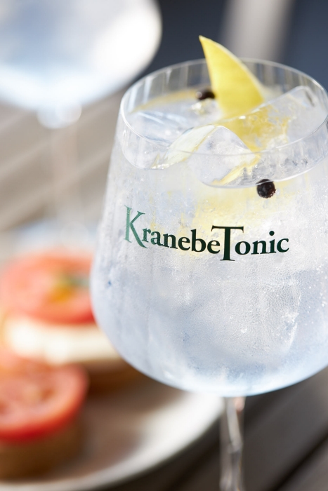 Riempire un bicchiere balloon con cubetti di ghiaccio. Aggiungere 1 parte di Kranebet e 3 parti di acqua tonica premium.
