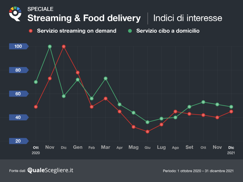 Nel periodo ottobre 2020 - aprile 2021 l’interesse per entrambi i servizi è stato elevato: infatti, le visite alla guida sul food delivery sono state superiori del 54% rispetto a quelle dell’ultimo periodo (maggio - novembre 2021), mentre per lo streaming on demand le visualizzazioni sono state addirittura del 70% più alte. Il maggior interesse per entrambi i servizi è stato rilevato nell’autunno - inverno 2020: per il food delivery l’indice massimo di interesse (100) è stato a novembre 2020, per lo streaming invece è stato a dicembre 2020.