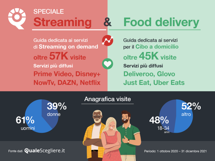 Inoltre, dall’analisi del traffico emerge che gli utenti - alla ricerca di consigli sui vari servizi oggi disponibili - hanno consultato maggiormente la guida dedicata ai servizi di streaming on demand (che totalizza oltre 57 mila visite negli ultimi 15 mesi), mentre la guida dedicata ai servizi per ricevere il cibo a domicilio ha superato le 45 mila visite.