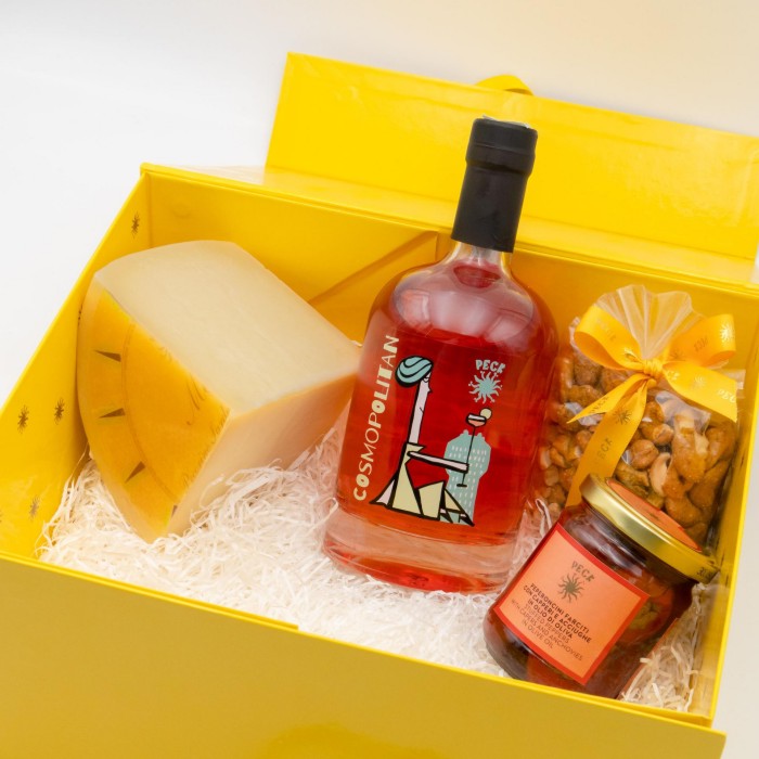 Il Cosmopolitan, uno dei cocktail più celebri al mondo, è proposto da Peck in una versione realizzata con alcol ottenuto da cereali di primissima qualità - dry curaçao proveniente da estratti naturali - e succo di limone e mirtilli. Dalle evocative atmosfere internazionali e cosmopolite, questo drink è da assaporare in un’elegante coppetta da cocktail ghiacciata, guarnita con una fetta di lime per un tocco finale di freschezza. Per un brindisi in compagnia, il Cosmopolitan viene anche proposto in una box aperitivo con prodotti Peck dai gusti vivaci, capaci di contrastare e mettere in risalto la dolcezza del drink: peperoncini farciti con capperi e acciughe, Pecorino sardo Maturo DOP “Medoro” e Anacardi salati al curry.