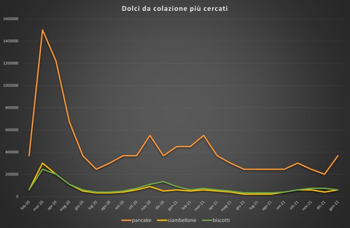A marzo 2020 le query relative ai pancakes sono arrivate a 1,5 milioni. Una nuova tendenza che ha accompagnato per tutta la primavera per poi tornare verso la fine dell’anno, in concomitanza con il secondo lockdown, con 550.000 ricerche assolute a novembre dello stesso anno. Sembra quasi che il pancake sia stato compagno di lockdown e quarantene, come dimostrano le 550.000 ricerche anche di marzo 2021, il mese della terza ondata.