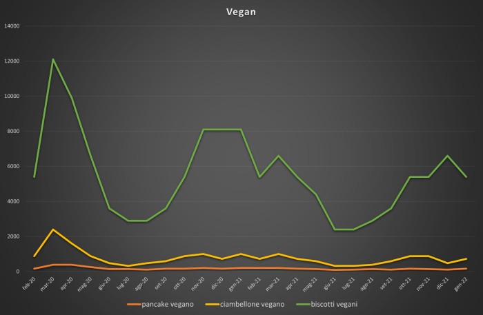 Chi invece si conferma soluzione vegan molto apprezzata è il ciambellone. Un dolce tradizionale che sta incontrando le nuove tendenze e abitudini alimentari, come si è visto nella versione senza uova. Negli ultimi 24 mesi, la media di ricerca mensile per la keyword “ciambellone vegano” è stata di 785 query, con il picco durante la pandemia (2.400 ricerche assolute a marzo 2020) e il fisiologico calo nei mesi estivi (320 le query di luglio 2021). Non si tratta, infatti, di una moda passeggera, come dimostrano le 720 ricerche di gennaio 2022: il ciambellone vegano continua ad attirare attenzione e interesse.