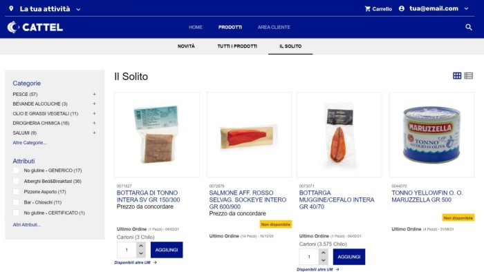 Eshop Cattel si suddivide in varie sezioni e funzioni di particolare praticità: la sezione “tutti i prodotti” consente di consultare l’intero assortimento, la sezione “novità” elenca i nuovi prodotti, la funzione “cerca” consente - digitando solo 3 lettere - di estrapolare prodotti specifici o cercare per categoria. Particolarmente apprezzata dalla clientela anche la sezione “il solito”, che elenca tutti i prodotti acquistati di recente da un cliente.