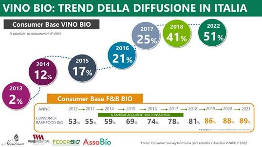 Per evidenziare il posizionamento e le prospettive di sviluppo del vino bio made in Italy in Italia e all’estero, è stata realizzata un’indagine ad hoc che ha coinvolto 800 consumatori italiani di vino e una ricognizione dei dati sui mercati internazionali grazie al contributo informativo della piattaforma www.ita.bio curata da Nomisma per ICE Agenzia e FederBio.