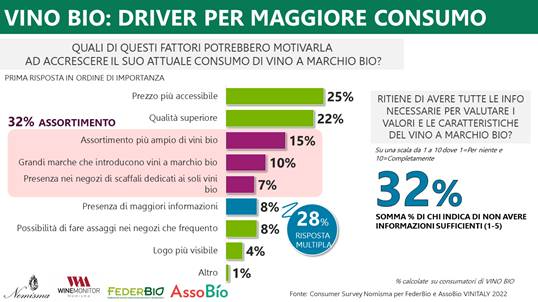 “Le opportunità di crescita per il vino biologico sul mercato italiano sono molto alte: non solo la consumer base è destinata ad aumentare negli anni a venire, ma l’interesse è collegato anche alla qualità che questi vini sono in grado di esprimere”, ha detto Silvia Zucconi, responsabile market intelligence di Nomisma. “L’interesse del consumatore è chiaro: il 32% degli attuali wine user bio sarebbe intenzionato ad accrescere il consumo attuale se l’assortimento venisse ampliato (gamma più profonda, grandi marchi che introducono referenze a marchio bio oppure presenza nei negozi di scaffali dedicati ai soli prodotti bio). La richiesta di avere informazioni aggiuntive sul vino bio, indicata dal 54% dei non user – è indice di alto interesse nei confronti de vino bio”.