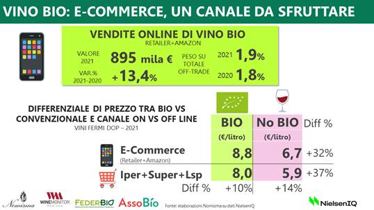 Degno di nota, sottolinea l'indagine, è il canale e-commerce: nonostante l’online rappresenti appena il 2% del canale off-trade e le vendite abbiano decelerato rispetto al boom del 2020, gli acquisti online continuano a crescere a doppia cifra (+13,4% rispetto al 2020) e ad orientarsi su prodotti di fascia di prezzo superiore. Il differenziale rispetto al vino bio venduto negli scaffali di iper e supermercati è difatti del 10%.