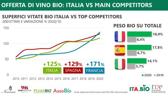 La leadership dell’Europa si segnala anche attraverso l’incidenza delle superfici vitate bio sul totale, che nel 2020 ha superato il 12% a fronte di una quota mondiale del 7%. In tale scenario l’Italia (117 mila ettari di vite con metodo biologico) detiene, insieme alla Francia, il primato per incidenza di superficie vitata biologica: 18% del totale. La concorrenza europea è però agguerrita: nel giro di un decennio le superfici bio in Italia sono cresciute del +125% (2020 vs 2010) contro il +129% degli spagnoli e ben il +171% messo a segno dai cugini francesi.