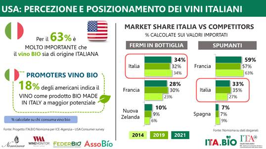 “E sono proprio gli Usa, il mercato a maggiore potenzialità per il vino bio italiano: primo consumatore di vino al mondo e primo destinatario dell’export vinicolo italiano, dove ben 1 consumatore su 3 (parliamo di circa 65 milioni di persone) beve vini biologici”, ha aggiunto Emanuele Di Faustino, senior project manager di Nomisma. “Un’ottima opportunità per le aziende italiane alla luce sia dell’elevata capacità di spesa degli americani sia dell’ottima percezione di cui godono i vini bio made in Italy: per il 63% dei consumatori statunitensi è infatti molto importante che il vino bio sia di origine italiana e il 18% indica proprio il vino come il prodotto bio made in Italy a maggior potenziale sul mercato USA”.