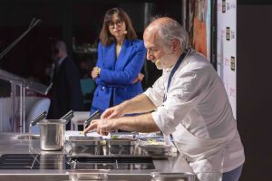 Carota novella di Ispica Igp e finocchietto selvatico. È una carota novella che grazie al clima caldo ha il primo raccolto a febbraio. “È di una dolcezza sconvolgente”. Viene cotta al dente a vapore 8 minuti, si aggiunge un aceto appena fermentato per dare acidità e vermouth e si abbina al finocchietto selvatico appena scottato al vapore, curry thailandese, un pizzico di peperoncino e un filetto candito di limone sciacquato a temperatura ambiente, miele ai fiori d’arancia e un cappero. Deve riposare in frigorifero per una notte sottovuoto (così si accelera il processo di marinatura).