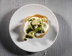 Fava fresca con bergamotto. Una reinterpretazione del grande classico fava e pecorino. La fava viene profumata da tanti ingredienti da tutta Italia. Come il candito di bergamotto calabrese di Nicola. Le fave sono spellate leggermente, cotte a vapore, si aggiunge origano secco e pepe nero, cipollotto e miele d’arancio e una nota acida assicurata da un aceto balsamico di Modena invecchiato solo tre anni. Alla cagliata di Pecorino si aggiungono pochi grammi di London dry gin.