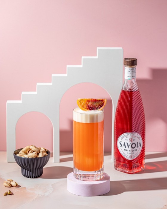 Ingredienti: 1 parte di Savoia Americano Rosso, 2 parti di spremuta di arance rosse siciliane, 4-5 cubetti di ghiaccio e uno spicchio d'arancia.