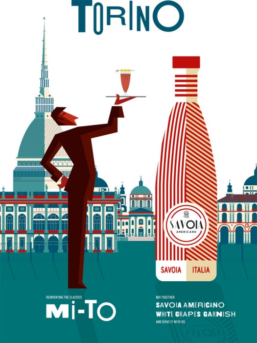 Small Caps, studio di grafica veneziano gestito da due giovani architetti, è partito da Torino, capitale dell’arte nobile di fare mixology, per realizzare una comunicazione visual su Savoia Americano. Le illustrazioni che ne sono nate, e che partono proprio dal Piemonte per attraversare l’Italia, mettono in luce lo stile di ogni luogo, abbinato a un cocktail che incarna l'anima della città protagonista.