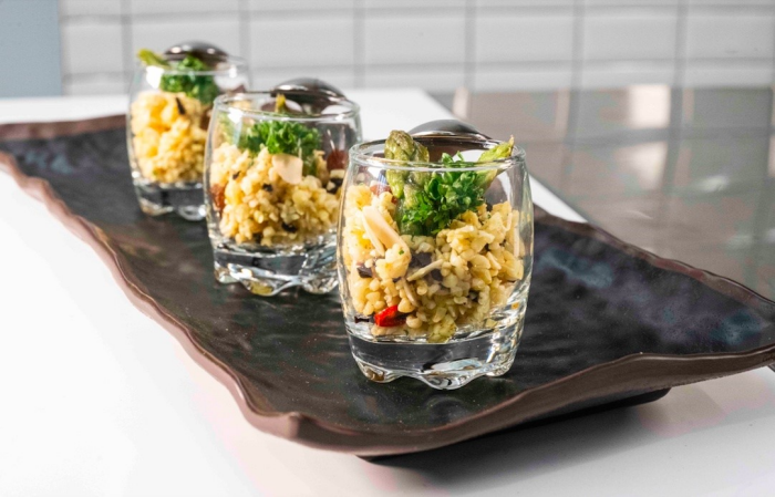 Tra le ricette proposte Lollipop di Falafel ai semini, Tartelletta di Snack spinaci, piselli e provola, robiola alla curcuma e petali di pomodoro essiccato, Insalata di Quinoa, lenticchie, mais e gamberi profumati all’arancia, Orzo perlato, ceci e mandorle con asparagi e olive al forno.