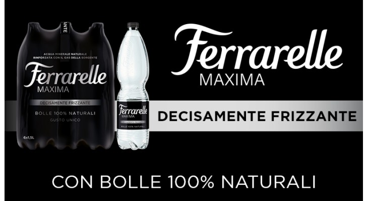 Ferrarelle Maxima è l’acqua decisamente frizzante con bolle 100% naturali, perché rinforzata con CO2 naturale della sua sorgente. Un nuovo modo di bere frizzante grazie al fine perlage e all’assenza di gas artificiale. L’origine naturale delle sue bolle, infatti, garantisce un sapore distintivo, con vivacità e gusto ad ogni sorso. Una referenza premiata anche al Superior Taste Award – certificazione riconosciuta dall'International Taste Institute di Bruxelles – risultando l’acqua frizzante italiana con il punteggio più alto.