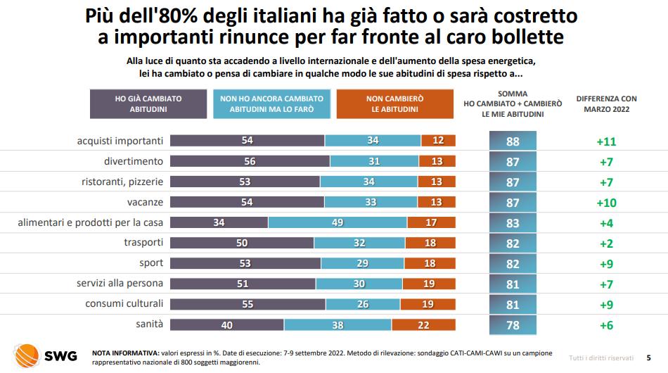 Come si è accennato prima, più dell'80% degli italiani ha già fatto o sarà costretto ad importanti rinunce per far fronte al caro bollette. Oltre agli acquisti però, nella lista della spending review finiscono anche vacanze, sanità, sport, ristoranti, pizzerie, bar e divertimento in generale. Ciò innesca dunque il timore che dopo gli anni durissimi della pandemia e dei lockdown, adesso il settore del fuoricasa e dei pubblici esercizi possa essere nuovamente bersaglio di una nuova ed importante crisi.