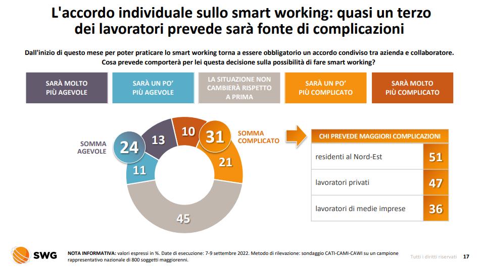 La ricerca di SWG pone l'accento anche sullo smart working, modalità lavorativa applicata su larga scala durante i mesi pandemici e che, pare, oltre ad aver giocato un ruolo positivo nell'equilibro tra vita privata e lavoro, sia riuscita ad aumentare la produttività e portare a risultati migliori. C'è un rovescio della medaglia però, rappresentato dalle relazioni coi colleghi e coi superiori.