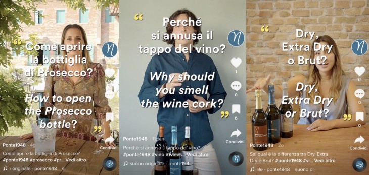 Un pubblico enorme al quale Viticoltori Ponte si presenta con l'account @ponte1948, aperto da pochi giorni e già con buoni riscontri. I primi contenuti appartengono alla categoria edutainment (divertimento educativo) e sono clip di circa 15 secondi durante i quali l'azienda stessa, attraverso il volto e la voce dei propri dipendenti, svela in maniera semplice e informale le basi della cultura enologica.
