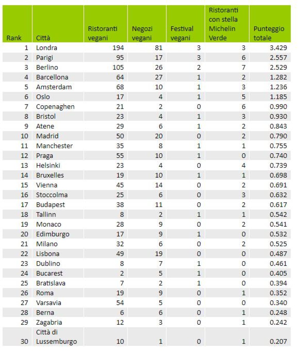 Londra è in cima alla classifica, con un punteggio totale di 3.429 (su 4). La capitale del Regno Unito ospita ben 194 ristoranti vegani e 81 negozi plant-based. La città ospiterà anche tre festival completamente vegetali nel 2023. Parigi si è classificata al secondo posto, con un punteggio di 2.557, che ha ricevuto in parte grazie ai suoi 95 ristoranti vegani e 6 ristoranti con una stella Michelin Verde. Berlino è arrivata terza ed è ufficialmente la prima città tedesca per vegani, con un punteggio di 2.529. Con 7 ristoranti con stelle Michelin Verdi, Berlino ha un punteggio più alto in questa categoria rispetto a qualsiasi altra città in Europa.