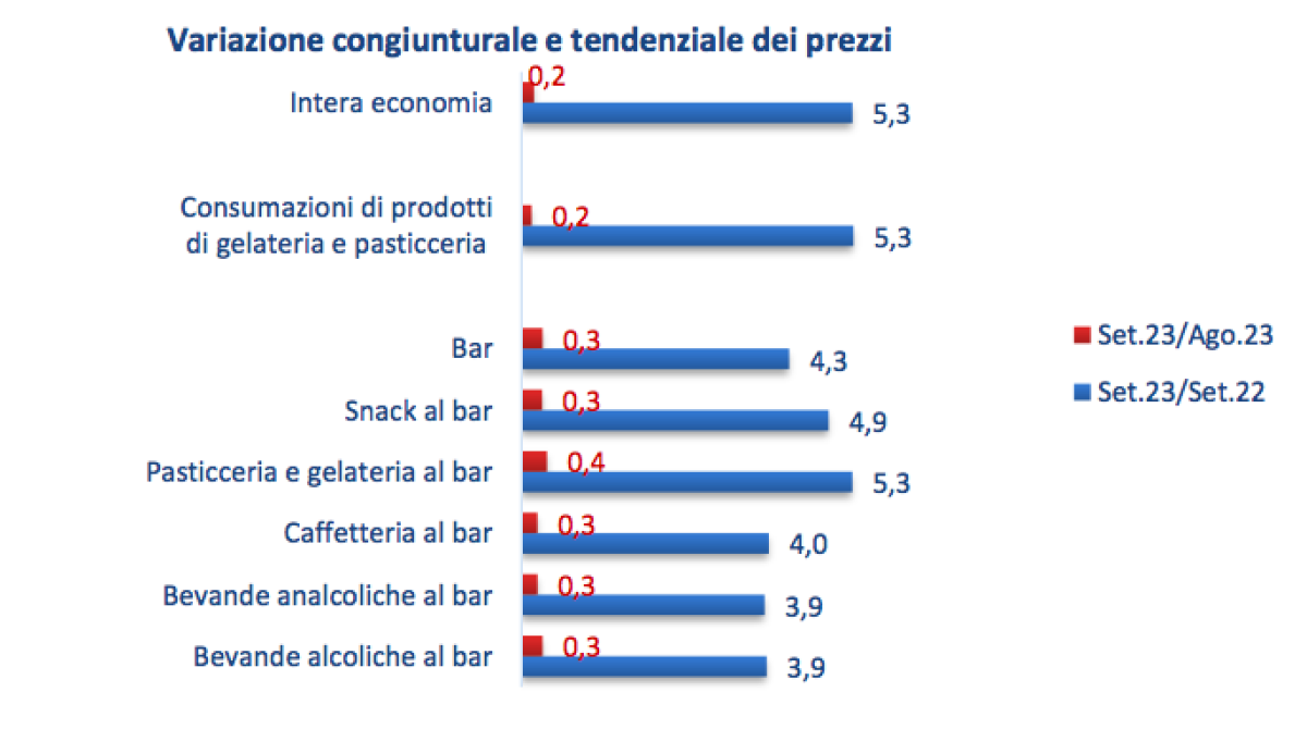 Nei bar, la spinta inflattiva si attesta a settembre al +4,3%, decelera dunque lievemente rispetto ad agosto che aveva segnato il +4,7%. Gli incrementi sopra la media del comparto riguardano ancora i prodotti di pasticceria e gelateria (+5,3%) e gli snack al bar (4,9%). La caffetteria segna il +4%, mentre le bevande analcoliche e alcoliche il +3,9%.