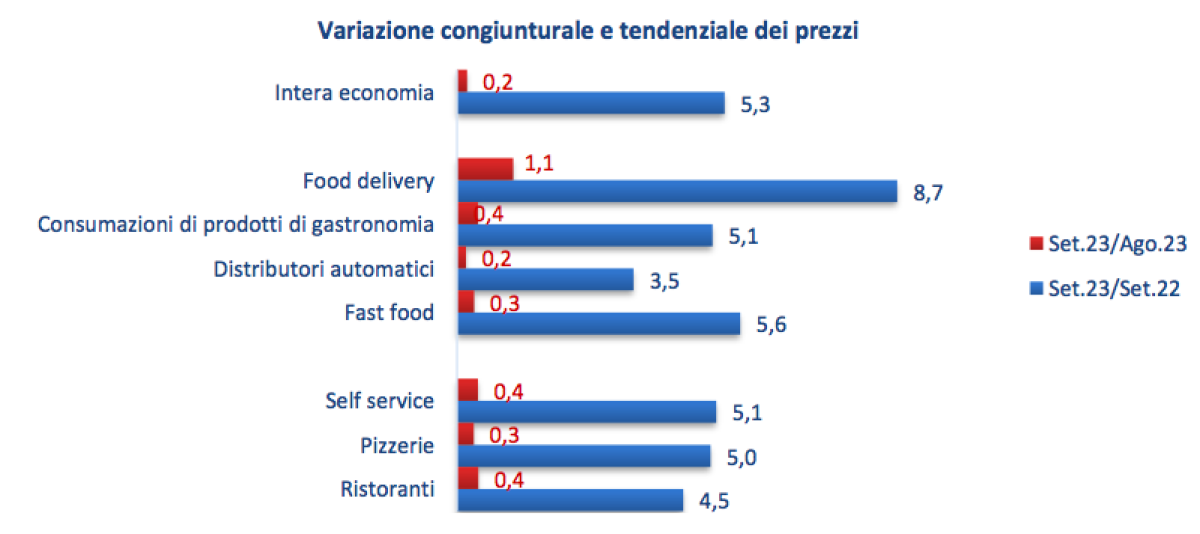 Anche i prezzi nei ristoranti tradizionali e nelle pizzerie decelerano. La variazione rispetto allo stesso periodo dell’anno precedente si attesta al +4,5% per i ristoranti e al +5% per le pizzerie. I prezzi della gastronomia registrano il +5,1% e il delivery il +8,7% su settembre 2022.