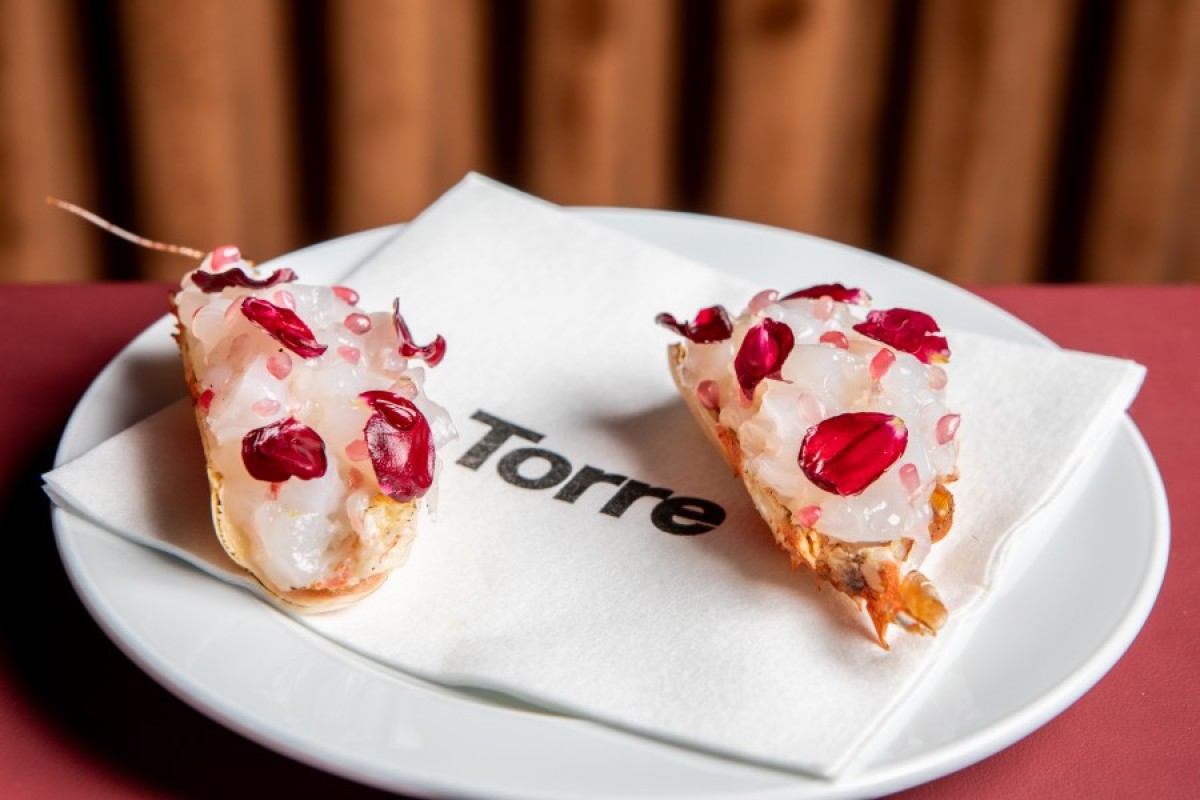 Lo scampo viene pulito e marinato nell’olio alla rosa, con qualche goccia di lime e zest, per circa 15/20 minuti. La testa viene tagliata a metà, pulita e passata sulla brace che farà da cucchiaio.