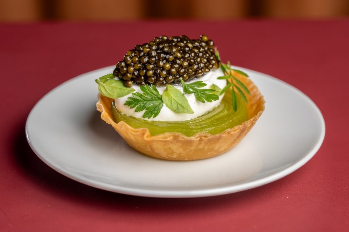 Per rifare la tartelletta potete acquistare della pasta sfoglia o fillo, da cuocere al forno. Il cetriolo viene tagliato fine e lo sovrapponiamo formando una spirale. Lo condiamo poi semplicemente con olio, sale e pepe serviamo il tutto con panna acida e caviale.