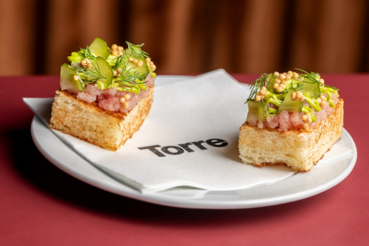 Si tratta di un semplice pane tostato dorato, servito con tartare di vitello, maionese all’aneto e cetriolo pickles. Gli aromi che utilizziamo sono senape e un profumo di aneto. Se volete rifare la maionese, mixate in un frullatore a bicchiere dell’aneto fresco con dell’olio e lasciamolo maturare 3-4 giorni. Al posto dell’olio extra vergine utilizziamo poi quest’olio per creare una maionese freschissima, con cui andremo a condire la tartare. Guarnire il tutto con dei cetrioli pickle.