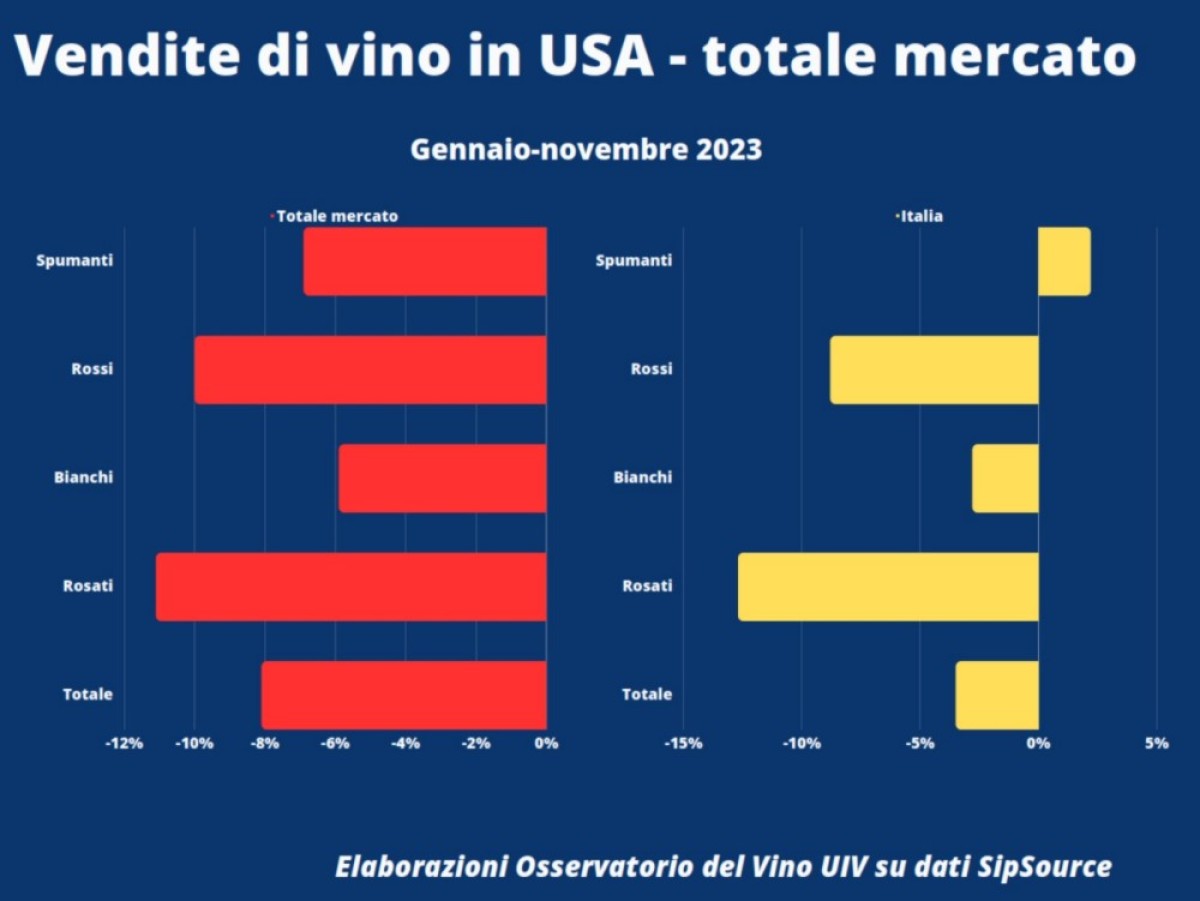 A novembre 2023, gli spumanti si sono confermati la tipologia italiana più consumata negli Stati Uniti, con una quota che sfiora il 38% contro il 35,5% dei bianchi e il 17,5% dei rossi, questi ultimi in forte regressione (-16%). Le difficoltà dei rossi non si limitano però ai prodotti del Belpaese: nel 2023 il calo sul totale del mercato è del 10%, bissato da un novembre a -15%. Unica voce in positivo i cocktail wine, che crescono del 2% sia a novembre sia nel computo degli 11 mesi.